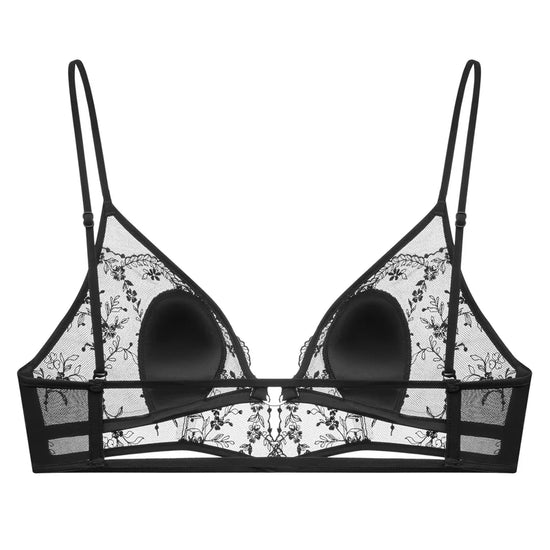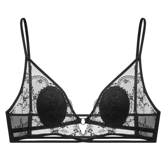 Immerse yourself in the luxurious embrace of our Black Lace Bralette, where modern sophistication meets timeless elegance. Crafted from the finest sheer lace, this bralette showcases an intricate floral embroidery that dances across its delicate fabric. The triangular silhouette, complemented by adjustable thin straps and a central metal ring, offers both style and functionality, ensuring a perfect fit that flatters every curve. Designed for the discerning individual who values both beauty and craftsmanship, this bralette is more than just an undergarment—it's a statement of refined taste and elegance.